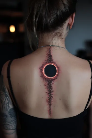 This tattoo places a dramatic solar eclipse right in the middle of the spine. A deep black circle is ringed with a glowing rim of fiery orange, creating a powerful contrast that makes it look as if the sun is bursting from behind the shadows. The energy radiates outward in jagged lines, stretching vertically along the spine in a way that feels both intense and mesmerizing.