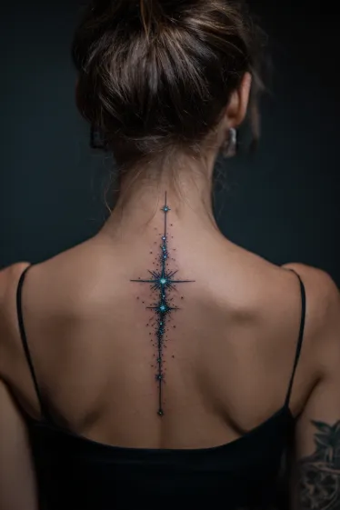 This tattoo centers a glowing starburst right in the middle of the spine, stretching upward and downward with sleek fine lines. Deep shades of blue and teal bring the center star to life, while scattered smaller stars sparkle around it like fragments of the night sky. The design feels sharp yet delicate, with symmetry that draws the eye and makes the whole piece look polished and radiant.