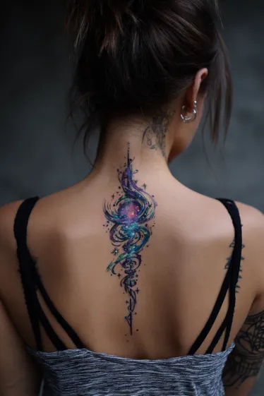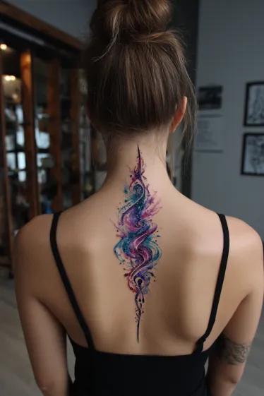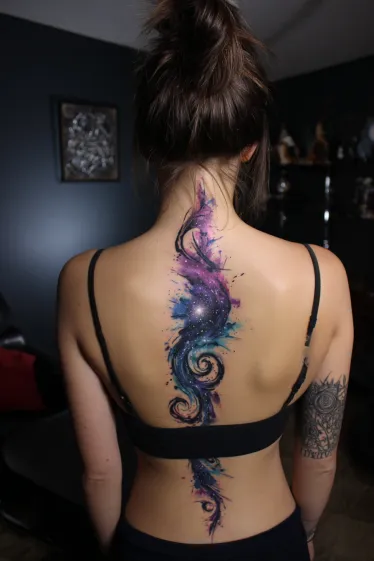 This tattoo runs straight down the spine with a flowing galaxy design that feels alive with color. Shades of violet, indigo, and teal burst out in soft watercolor splashes, while glowing white stars scatter throughout the piece. The swirling spirals add movement, making it look like stardust is in constant motion across the skin.