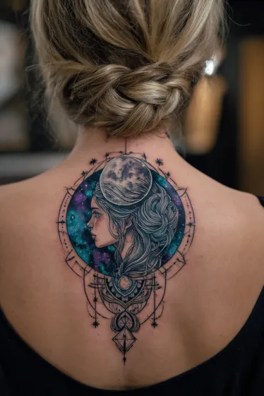 I think this tattoo is incredible because it feels like both a piece of art and a piece of the universe. The portrait gives it personality and depth, while the celestial details tie it to something bigger and more symbolic. To me, it feels like wearing your inner goddess proudly on your back, which makes it not only stunning but also empowering.