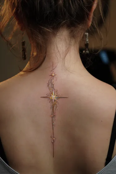 This tattoo features a luminous starburst at the center of the spine, with delicate fine line details extending both upward and downward. Soft golden and pastel tones bring the design to life, while tiny accents of sparkle surround the star, creating the feeling of light radiating outward. The slender vertical line makes the whole piece feel elegant and refined, almost like wearing a celestial pendant down the back.