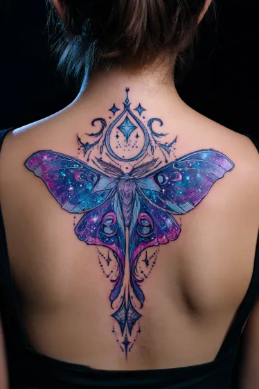 This tattoo spreads beautifully across the upper back with a large moth whose wings glow in shades of blue, violet, and pink. The wings are decorated with tiny star-like details, giving them the look of a galaxy captured in flight. Ornamental patterns surround the moth and extend down the spine, adding elegance and symmetry to the design. The placement makes the wings fan out perfectly across the shoulders while keeping the spine as the center of balance.