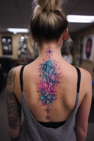 This tattoo runs down the spine with glowing crystal clusters in shades of blue and pink, surrounded by radiant starbursts. The crystals shimmer with highlights, and tiny stars scattered around them give the whole piece a cosmic sparkle. The symmetry of the design ties it neatly to the spine, while the vibrant colors make it look like a magical shard of the universe etched onto the skin.