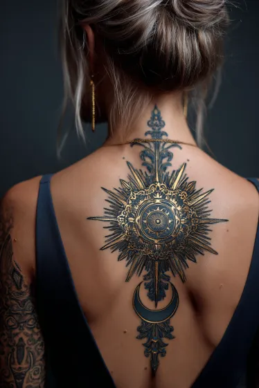 This tattoo features a radiant mandala centered on the spine, with a glowing golden sun encircling a crescent moon. The rays extend outward in detailed strokes, blending warm gold with cooler silvery tones that create a soft shimmer effect. Ornamental flourishes above and below the central design add balance, making the piece feel like a celestial jewel aligned perfectly down the back.