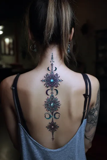 This tattoo runs along the spine with a sequence of moon phases framed by intricate mandala patterns. The design glows in shades of teal, purple, and deep blue, with sparkling star-like details scattered throughout. Each section flows into the next, giving the piece a harmonious rhythm that feels perfectly suited for the natural line of the back. The ornamental shapes make the moons look like celestial jewels suspended in space.