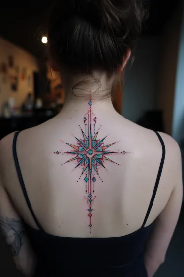 This tattoo stretches across the back with a large starburst design centered along the spine. Bold lines and sharp points radiate outward, while smaller geometric shapes add symmetry and precision. The mix of teal and red tones gives it a vibrant energy, with fine dotted details making it feel celestial and almost jewel-like. It s structured yet artistic, with an elegance that shines through the careful placement.