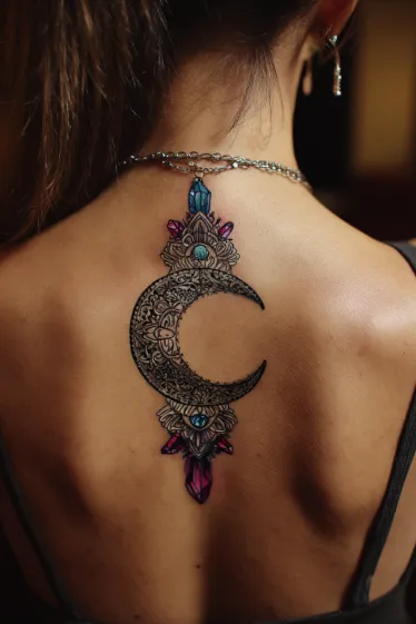 This tattoo places a beautifully detailed crescent moon at the center of the spine, filled with delicate ornamental patterns that almost look like lace. The design is framed with glowing crystals in shades of blue, purple, and pink, which add a mystical pop of color. The placement makes the crescent curve flow naturally with the back, while the crystal accents draw the eye both upward and downward, elongating the overall look.