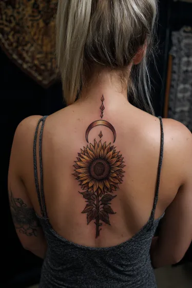 I love this tattoo because it feels warm, vibrant, and symbolic all at once. The sunflower brings a sense of life and positivity, while the crescent moon adds a mystical and celestial edge. To me, it s the perfect mix of grounded beauty and cosmic wonder, and it looks stunning with the spine placement that naturally elongates the design.