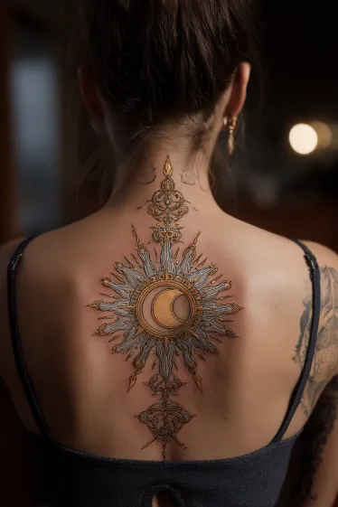 I think this tattoo is incredible because it feels powerful and luxurious at the same time. The golden highlights make it look almost like jewelry, while the balance of the sun and moon gives it a symbolic depth. To me, it s the kind of tattoo that feels like wearing a crown on your back, both striking and enchanting in every way.