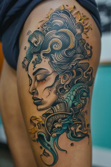 This dreamy thigh tattoo reimagines an African Queen in a surreal, almost ethereal style. Her face is calm and elegant, with soft shading and golden accents that glow just enough to catch the eye. But it s the hair that steals the spotlight. It swirls and flows like a stormy ocean, filled with teal waves, curving lines, and abstract shapes that move with the body. The whole piece has this whimsical, flowing energy that feels like fantasy meeting royalty.