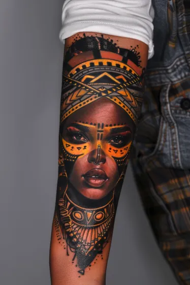 This striking forearm tattoo showcases a powerful African Queen with rich brown skin, piercing eyes, and intricate tribal face paint in warm orange and yellow tones. Her head is wrapped in patterned fabric that blends perfectly with the detailed background, featuring bold geometric shapes and cultural motifs. The design flows beautifully down the arm, with layered necklaces and delicate ornamentation completing the regal look. The contrast between the deep black ink and the vibrant colors makes everything pop, especially her commanding facial expression.