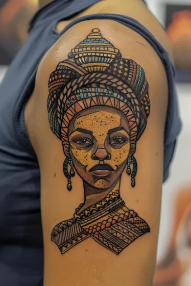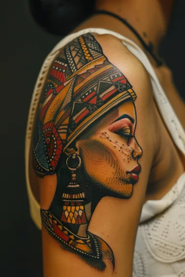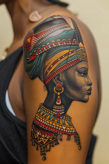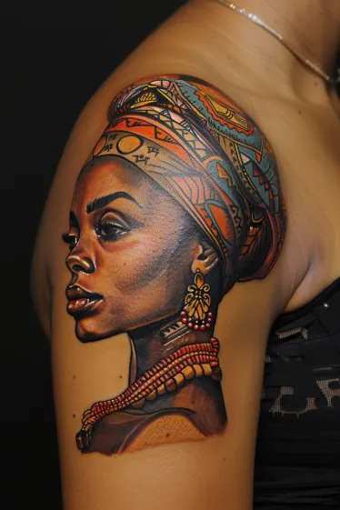 This gorgeous shoulder tattoo captures the profile of an African Queen in full color and elegant detail. Her features are graceful and strong, with a tall headdress wrapped in rich shades of emerald, gold, and crimson. The headwrap is paired with bold jewelry layered in intricate patterns, giving the whole design a regal and timeless vibe. Everything about her pose radiates pride and poise, from the curve of her jaw to the tilt of her chin. It s one of those pieces that feels like it could belong on a canvas just as easily as on skin.