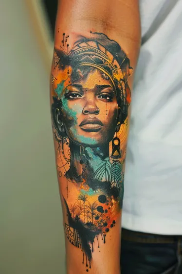 This vibrant watercolor tattoo lights up the forearm with a fierce yet graceful portrait of an African queen. Her expression is bold and steady, with just a hint of softness in her gaze. Swirls of turquoise, orange, and yellow paint splash across her face and hair wrap, blending effortlessly into tribal symbols, subtle palm silhouettes, and abstract textures. The entire piece feels like a dreamy watercolor painting frozen in time, full of movement and energy.