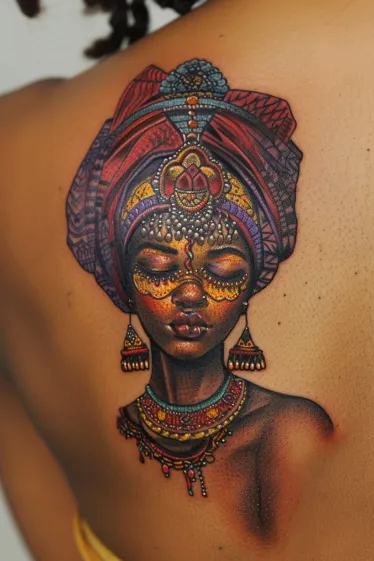 This radiant back tattoo captures an African Queen in a peaceful moment, eyes closed and glowing with grace. Her headwrap is layered with rich reds, purples, and golds, woven into a majestic pattern that draws the eye straight to her crown. Every detail from her jewelry to her glowing cheek markings is packed with color and shimmer, making the entire piece feel almost like a jewel. The shading is soft and velvety, adding depth to her skin and giving her this divine glow that s just everything.