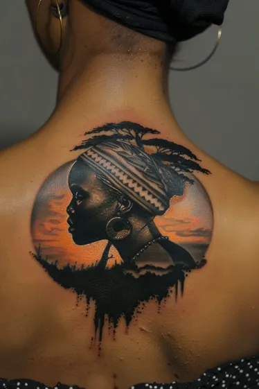 This breathtaking back tattoo features a side-profile portrait of an African Queen, silhouetted against a glowing orange sunset. Her headwrap is detailed with tribal patterns, and her earrings glimmer with soft highlights that bring her silhouette to life. The tattoo is framed by a circular horizon, with a lone tree branching into the sky and subtle skyline shapes melting into an abstract ink-like base. It s like the whole design is a window into a calm, powerful memory.