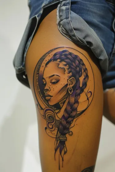 This gorgeous thigh tattoo features an African Queen with long, flowing braids that wrap delicately through the circular frame surrounding her face. Her expression is soft but confident, with a slightly tilted head and eyes closed like she s lost in a moment of peace. The purple hues in her hair add a dreamy, magical vibe that totally transforms the whole look. Paired with swirling ornamental elements and sharp linework, the entire piece feels graceful, feminine, and totally fierce.
