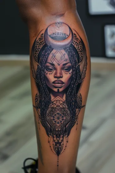 I m honestly in love with how this piece feels grounded and otherworldly all at once. Her expression is powerful without even trying, and that moon element just seals the vibe. There s something really enchanting about how the patterns wrap around her like a protective aura. If you re into tattoos that feel sacred, symbolic, and stylish all in one, this one seriously hits the mark.