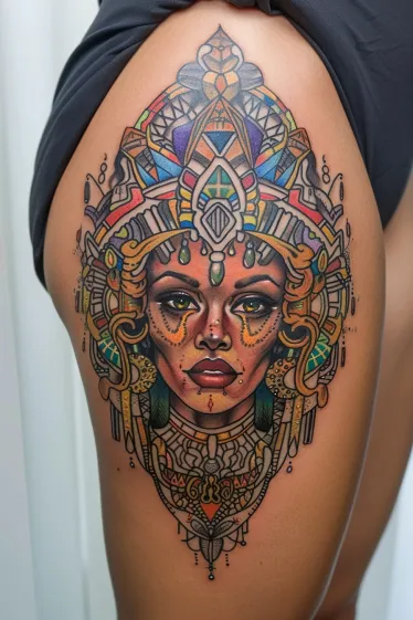 This mesmerizing thigh tattoo features an African Queen with a stunningly detailed crown of ornamental shapes and layered gemstones. Her face is soft yet commanding, painted with glowing gold tones and striking tribal-inspired patterns. Surrounding her are symmetrical, jewel-toned designs that stretch outward like stained glass or an elaborate temple gate. It s rich in color, balanced in structure, and absolutely hypnotic to look at from every angle.