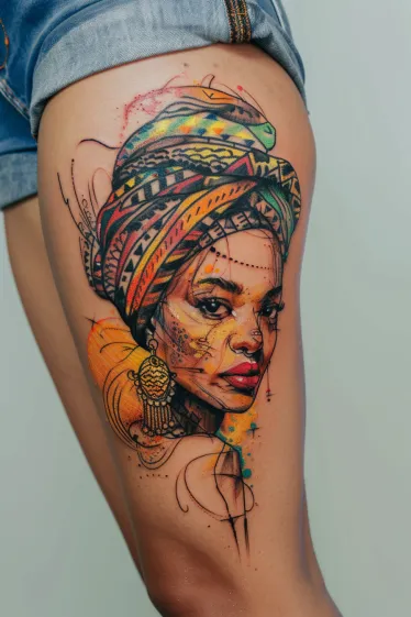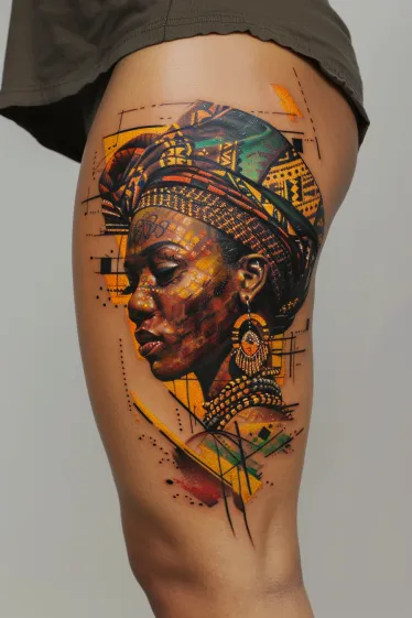 This bold and beautiful thigh tattoo showcases an African Queen with her head gently tilted, eyes closed in a moment of calm. Her headwrap and jewelry burst with traditional patterns in vibrant yellows, greens, and reds, layered over a glowing mix of watercolor splashes and abstract lines. The entire design feels alive with motion, like a painting frozen mid-brushstroke. There s a perfect balance between raw expression and detailed portrait work, giving it a super artsy, high-impact vibe.
