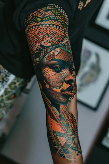 This stunning full sleeve tattoo takes the idea of an African Queen and spins it into a work of modern art. Her face is built with soft shading and layered with vivid geometric shapes, tribal textures, and patterned overlays that weave around the arm like fabric. The deep greens, burnt oranges, and earthy browns all blend together so seamlessly, it feels like a mosaic brought to life. Her calm, confident expression pulls you in while the abstract design adds a fierce creative edge.
