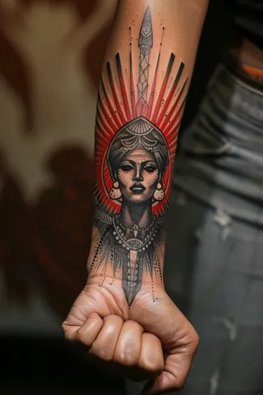 This fierce forearm tattoo shows an African Queen in full warrior mode, radiating strength and power. Her face is framed by bold jewelry and a patterned headdress, with perfectly symmetrical details that feel sharp and purposeful. The background features dramatic red and black rays shooting upward, leading into a spear that aligns with the arm s center. The overall composition feels like a mix of tribal elegance and divine energy, giving major queen-meets-goddess vibes.