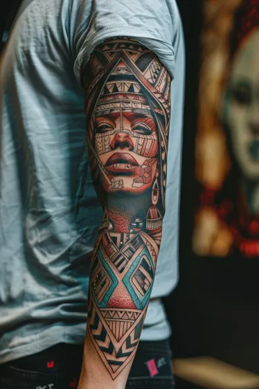 This full sleeve tattoo is packed with geometric energy and powerful symbolism. The African queen at the center wears a mask-like expression made of angular tribal patterns that stretch and flow seamlessly across the arm. Earthy reds and deep blacks dominate the color palette, with pops of turquoise adding an unexpected contrast. From her regal headdress to the intricately detailed designs wrapping around the bicep and forearm, every inch of this sleeve tells a story of culture, strength, and sacred beauty.