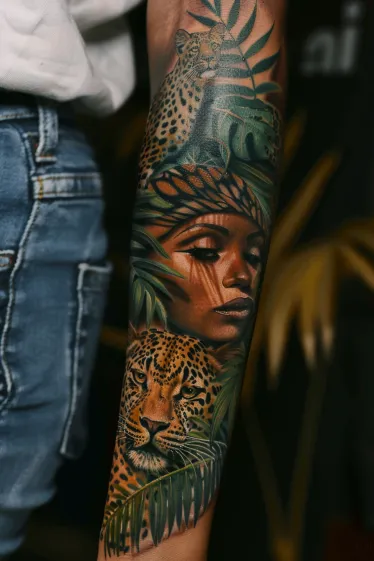 This stunning forearm tattoo brings the wild to life with a powerful mix of realism and natural beauty. At the center is an African Queen with serene eyes and glowing brown skin, her head wrapped in leaves and jungle shadows. Just above and below her are two majestic leopards, their golden eyes piercing through lush greenery. The entire piece is wrapped in tropical foliage, giving the illusion that she s one with the wild. Every detail, from the texture of the leaves to the fur on the leopards, is incredibly lifelike.