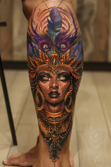 This jaw-dropping leg tattoo transforms an African Queen into a divine vision of royalty and radiance. Her glowing brown skin is framed by rich golden jewelry, oversized hoops, and a majestic headdress that blends seamlessly into vibrant purple and blue peacock feathers. The color contrast is electric, especially where the gold meets the deep jewel tones. Her eyes are closed, giving her an otherworldly presence, like she s in tune with something powerful and sacred.
