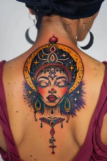 I m so drawn to this one because it feels like a mix of goddess energy and galactic vibes. Her closed eyes say calm, but the colors say queen. I love how the design flows down the spine so naturally, and the starry halo just makes it pop. It s soft and radiant and seriously makes me want to book a tattoo appointment tomorrow. This is one of those tattoos that feels both spiritual and stylish, and I m totally here for it.