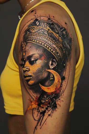 This breathtaking upper arm tattoo shows a queen in serene profile, her eyes closed like she s deep in thought or whispering secrets to the stars. Her headwrap is packed with golden detail that gives off serious royal energy, and the crescent moon resting near her neck glows with a fiery orange hue. Splashes of ink trail off around the portrait, blending sketchy lines with watercolor textures that feel raw and artistic in the best way.