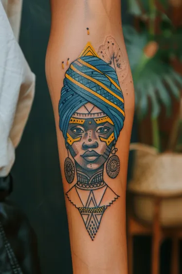 This eye-catching forearm tattoo blends bold linework with pops of deep blue and mustard yellow, creating a modern take on an African Queen. Her turban is wrapped with perfect symmetry, and her face is decorated with tribal patterns and face paint that feel both sacred and stylish. The earrings and necklace are filled with detailed geometric shapes that tie everything together beautifully. The whole piece has a clean, graphic look that still feels full of personality and depth.