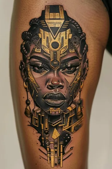 This electrifying thigh tattoo reimagines an African Queen with a futuristic, almost cyber-goddess twist. Her face is strong and sculpted, framed by intricate gold and black mechanical elements that feel straight out of a sci-fi film. The headpiece, earrings, and geometric shapes blend into her skin like armor, creating a powerful fusion of tradition and technology. Every detail looks sharp and intentional, from the metallic shine to the bold lines that structure the entire piece.