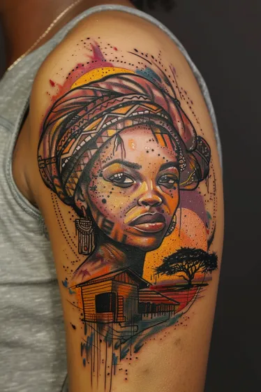 This stunning shoulder piece captures the quiet power of an African queen set against a dreamy watercolor sunset. Her gaze is strong and thoughtful, framed by a wrapped headscarf with intricate tribal patterns. The tattoo blends fine black linework with vibrant swirls of orange, pink, and violet, which splash across the background like a painted sky. There s even a little countryside scene below her neck with a tree and house, adding a beautiful storytelling vibe to the whole design.