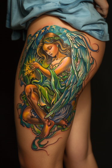 This mesmerizing thigh tattoo brings a guardian angel to life with radiant colors and intricate details. Draped in flowing green and blue robes, the angel exudes a serene energy, holding a glowing celestial light in her hands. Her delicate wings, detailed with soft whites and icy blues, extend gracefully behind her, adding depth and movement. The background sparkles with a dreamy, starlit sky, giving the entire piece an ethereal, almost magical feel. The design wraps beautifully around the thigh, making it both eye-catching and elegant.