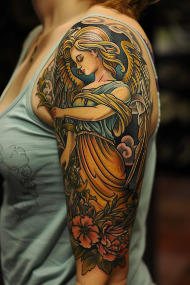 This breathtaking half-sleeve tattoo features a serene guardian angel surrounded by delicate floral elements. The angel s golden wings contrast beautifully against her flowing blue and orange robes, giving the piece a rich and warm color palette. Her gentle expression and graceful posture create a sense of peace and protection, while the intricate details in the flowers and leaves add a natural elegance. The way the design wraps around the arm makes it feel like a living work of art, flowing seamlessly with the body s curves.