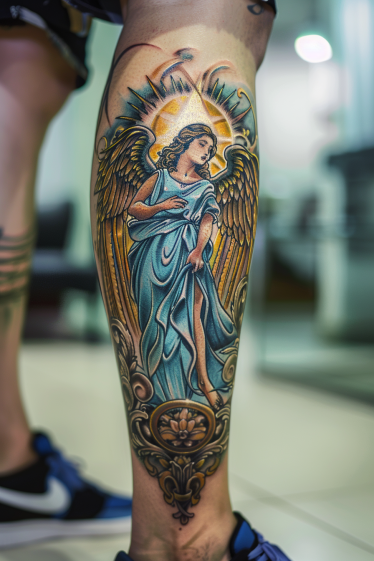 This elegant leg tattoo transforms the guardian angel into a timeless piece of art. The angel stands gracefully, draped in flowing blue robes, her expression serene and watchful. Golden wings spread behind her, complemented by a radiant halo that seems to glow against the skin. The ornamental frame at the bottom adds a classic, almost stained-glass effect, giving the design a sense of sacred beauty. The use of rich blues, warm golds, and soft shading creates depth and dimension, making this piece a striking blend of realism and classic tattoo artistry.