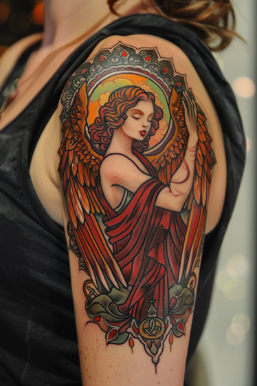 This stunning upper arm tattoo showcases a guardian angel in a beautifully artistic and ornamental style. The angel, draped in flowing red robes, radiates elegance and serenity. Her intricately detailed wings extend gracefully, complementing the symmetrical halo behind her head. The rich golden hues contrast with the deep reds, making the design feel regal and timeless. The decorative elements surrounding the angel add an almost stained-glass effect, enhancing the divine energy of the piece. Every line and shadow is carefully placed, making this tattoo a true work of art.