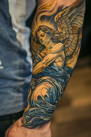 This stunning forearm tattoo brings a guardian angel to life with breathtaking detail and depth. The angel is depicted with a serene expression, golden curls cascading over her shoulders, and a radiant glow surrounding her. Her wings, intricately shaded with soft gold tones, extend gracefully, complementing the deep blue of her flowing robes. The swirling fabric creates a sense of movement, making it feel as if she is gently descending from the heavens. The contrast between warm and cool tones gives this tattoo a rich, painterly quality that makes it feel almost three-dimensional.