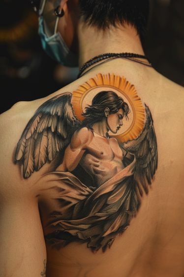Guardian Angel Shoulder Blade Tattoo With Radiant Halo