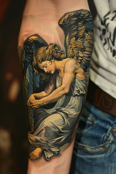 This breathtaking forearm tattoo captures a guardian angel in a moment of deep reflection. The soft folds of the flowing robe, the intricate detailing in the dark feathered wings, and the gentle pose create an emotional, almost poetic feel. Every shade and highlight adds dimension, making the angel appear almost sculpted onto the skin. The subtle contrast between the light fabric and the deep shadows of the wings gives it an incredible depth, making the design look lifelike. The placement on the forearm allows this piece to feel both personal and powerful, a constant reminder of protection and peace.