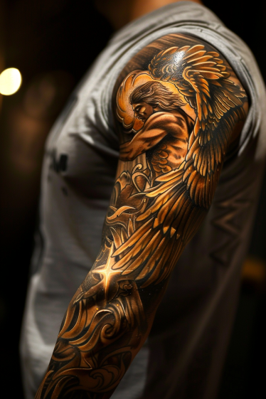 This breathtaking full sleeve tattoo captures a guardian angel in a striking, dramatic pose. The rich golden hues bring warmth and depth, making the angel appear almost illuminated against the skin. Flowing feathers and intricate shading give the wings a lifelike texture, while the angel s folded arms and solemn expression add a sense of quiet strength. Ornamental flourishes swirl down the arm, enhancing the divine energy of the piece. The seamless blend of light and shadow creates a mesmerizing effect, making this tattoo feel both powerful and deeply symbolic.