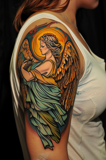 This stunning upper arm tattoo captures the grace and divinity of a guardian angel with breathtaking detail. Flowing robes in soft blues and greens contrast beautifully against golden wings that radiate warmth. A glowing halo frames the angel s serene face, adding to the celestial energy of the piece. The shading and bold outlines create a striking depth, giving the tattoo a vibrant yet timeless feel. The placement on the upper arm makes it both elegant and powerful, ensuring this heavenly figure remains a source of strength and comfort.