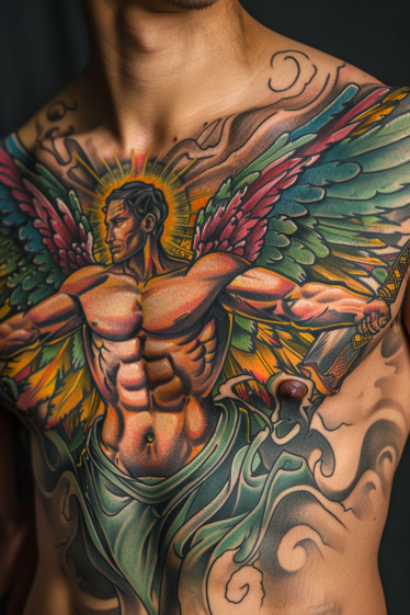 This striking chest tattoo transforms the guardian angel into a powerful and vibrant figure. The angel s muscular form spreads across the chest, exuding strength and protection. His multicolored wings, blending deep greens, blues, and reds, create a dynamic contrast against the golden glow radiating from behind. The flowing fabric around his waist adds movement, while the sword in his hand symbolizes justice and divine protection. Dark swirling patterns in the background enhance the intensity of the design, making it feel like a force of nature.