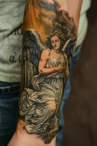This breathtaking forearm tattoo showcases a guardian angel in a moment of deep contemplation. The finely detailed wings stretch downward, framing the figure as she kneels in a flowing robe that drapes elegantly around her. Above, stormy clouds part to reveal a golden light, casting a soft glow over her serene expression. The rich contrast between the dark sky and the angel s illuminated presence gives this piece a dramatic, almost storybook-like quality, making it feel truly divine.