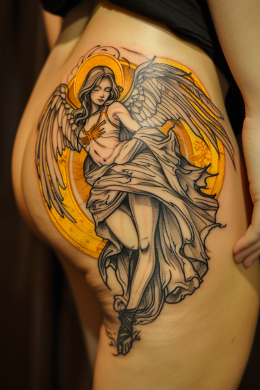 Guardian Angel Hip and Thigh Tattoo With Golden Halo