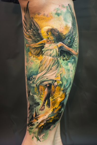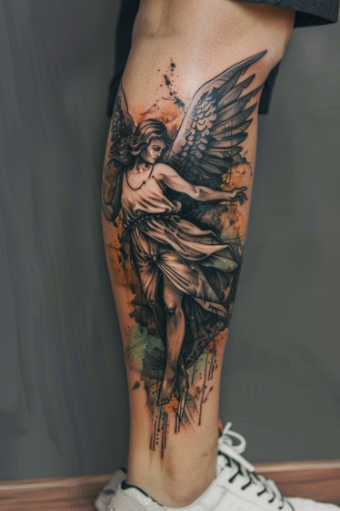 Guardian Angel Leg Tattoo With Watercolor Effect