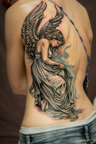 This breathtaking full-back tattoo captures a guardian angel in a moment of quiet grace. Her wings, delicately shaded with intricate detail, extend upward, adding depth and movement to the design. The soft folds of her flowing gown cascade down her body, giving the impression of gentle motion. A mist-like aura swirls around her, creating an ethereal effect that enhances the angel s presence. The black and grey shading adds a timeless elegance, making this piece feel both powerful and serene.