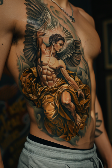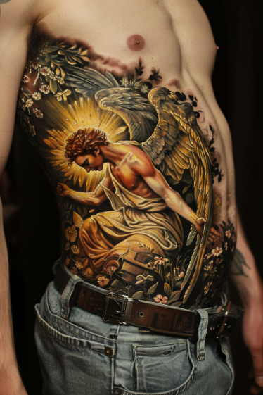 Guardian Angel Chest and Stomach Tattoo With Golden Robes