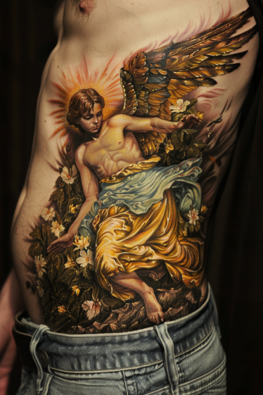 This mesmerizing side torso tattoo features a guardian angel kneeling in a moment of deep reflection. The intricate shading and masterful use of golden hues create an almost divine glow, making the angel appear illuminated from within. His detailed wings stretch upward, blending seamlessly into the floral background, adding depth and movement to the design. Flowing robes drape naturally around his form, with delicate highlights and shadows giving them a lifelike texture. The surrounding floral details add an organic touch, making this tattoo feel like a scene from a Renaissance painting.