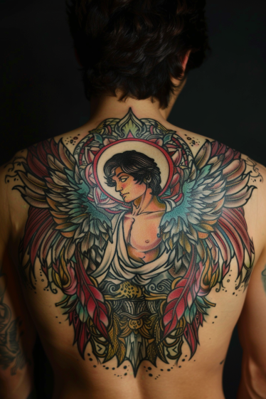 I can t get over how mesmerizing this piece is. The way the colors blend effortlessly makes the wings feel almost alive. There s something incredibly bold about choosing a full-back tattoo like this, and I love how it balances strength and grace. The details are insane, from the delicate shading on the face to the ornate patterns framing the angel. It s one of those tattoos that immediately catches your eye and leaves you staring in awe.